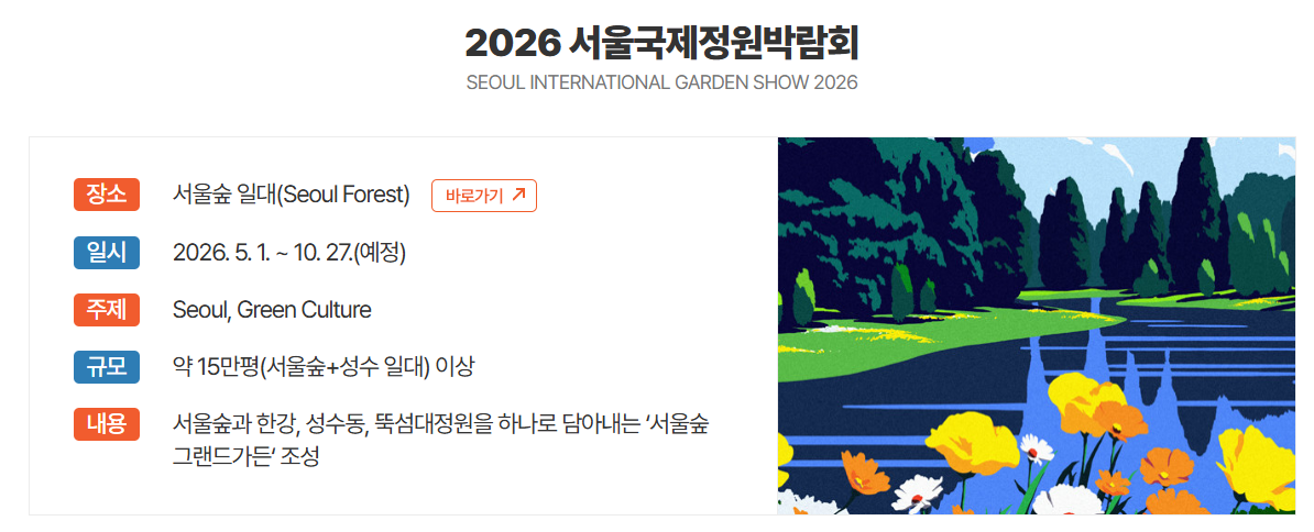 The Seoul International Garden Show (서울국제정원박람회) is Seoul City's annual flagship garden and landscape event — and it has grown into one of the largest outdoor cultural events in Korea. Each year it transforms a major public park into a world-class garden exhibition, combining commissioned works from international landscape artists with community gardens, brand installations, cultural programming, and live events.