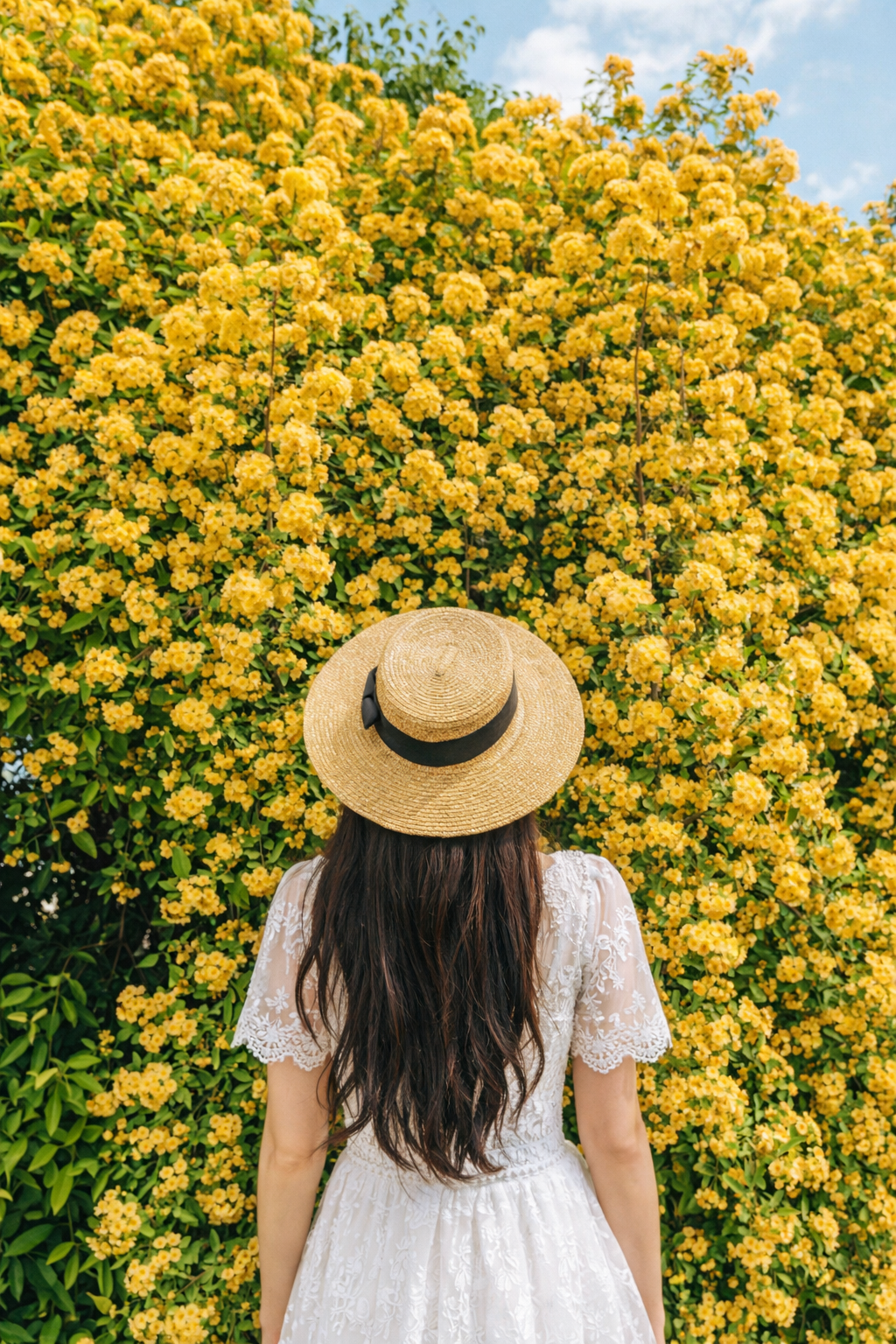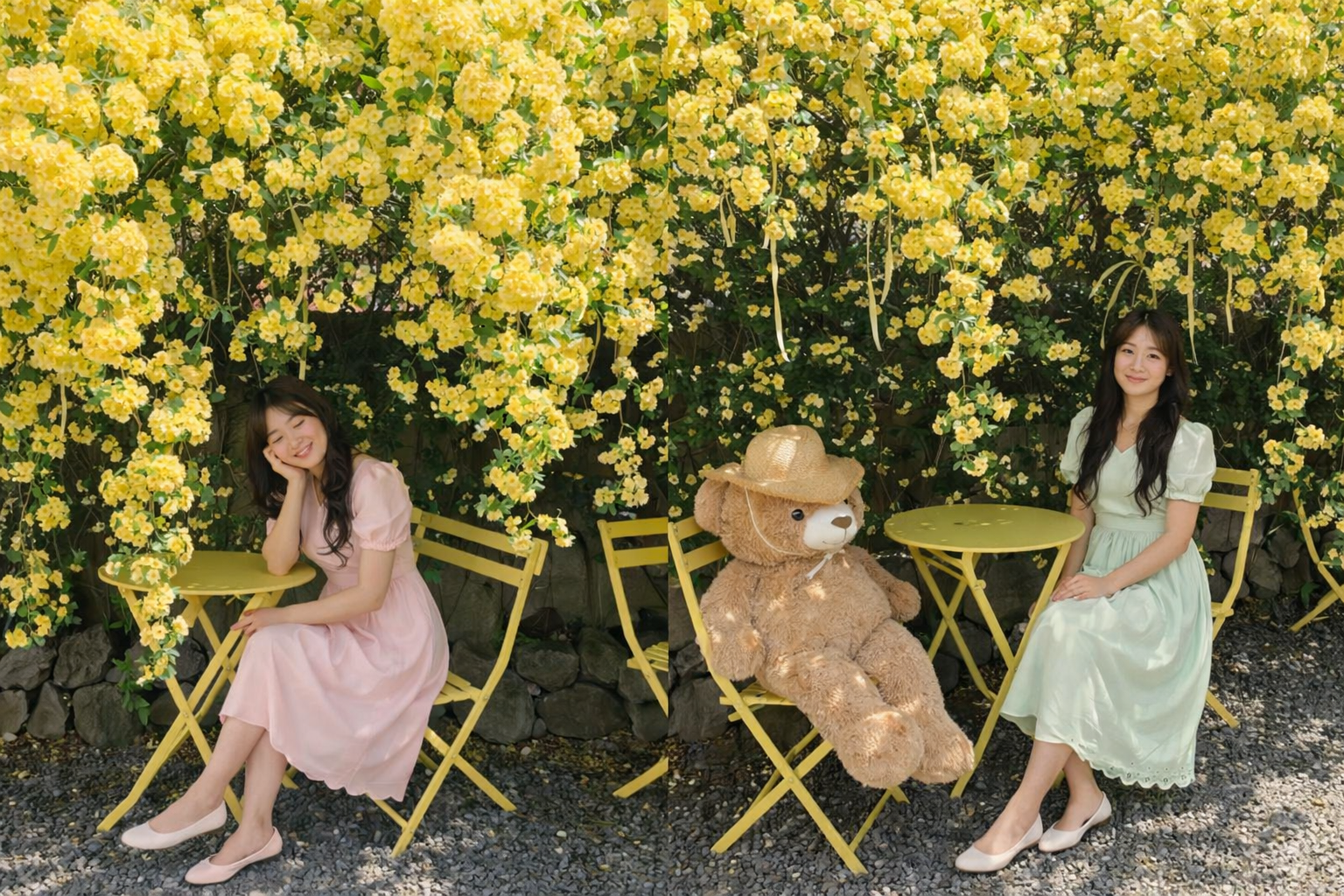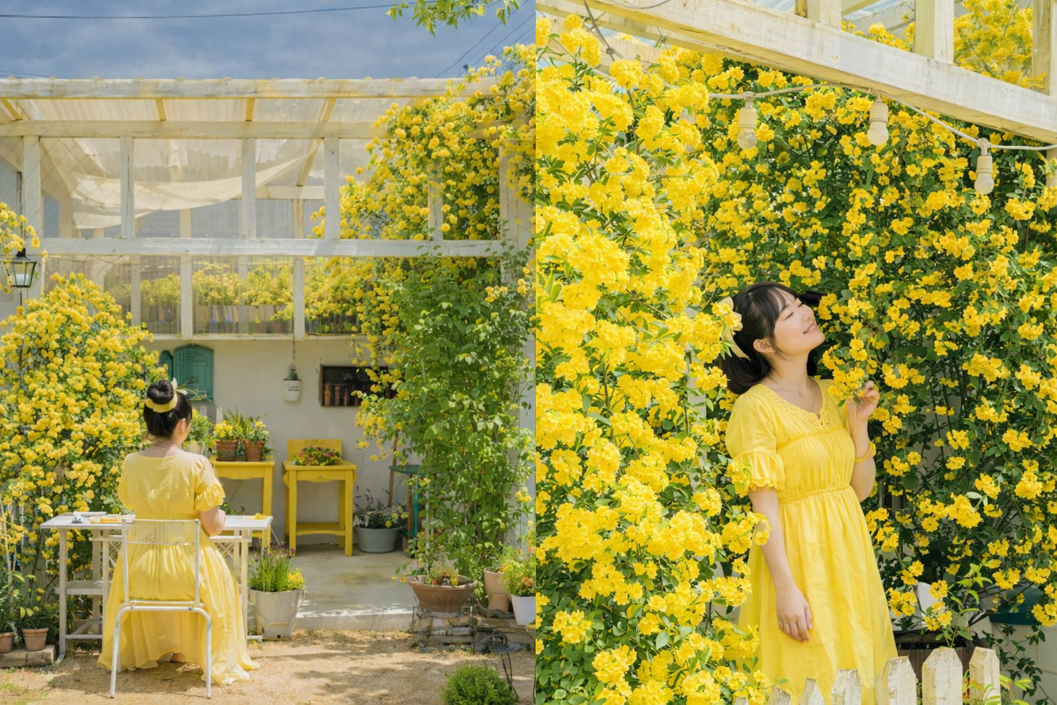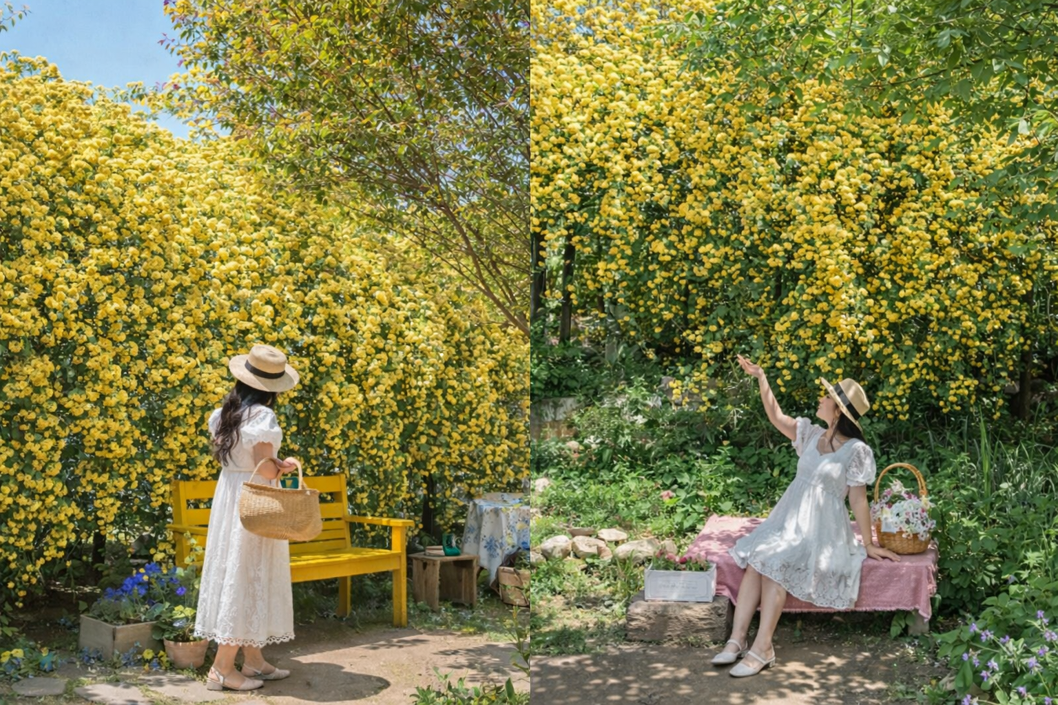 The contrast between the soft yellow Banksiae roses and a white outfit is genuinely magical in photos. The yellow pops even more, and the white keeps the overall look clean and bright. If you're visiting southern Korea in late April or May for these flowers, pack a white sundress or linen dress — you won't regret it.