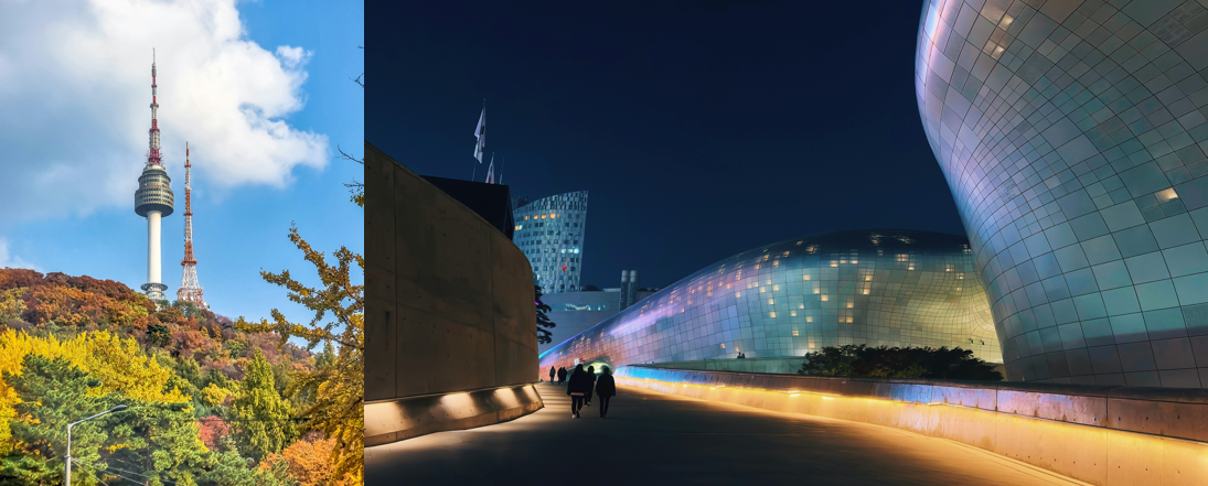 🏛️ Dongdaemun DDP + Naksan Park — Early evening. DDP is the futuristic curved structure designed by Zaha Hadid — genuinely unlike any building you've seen. Naksan Park sits on the hill above and is one of the best spots for Seoul's nighttime skyline.